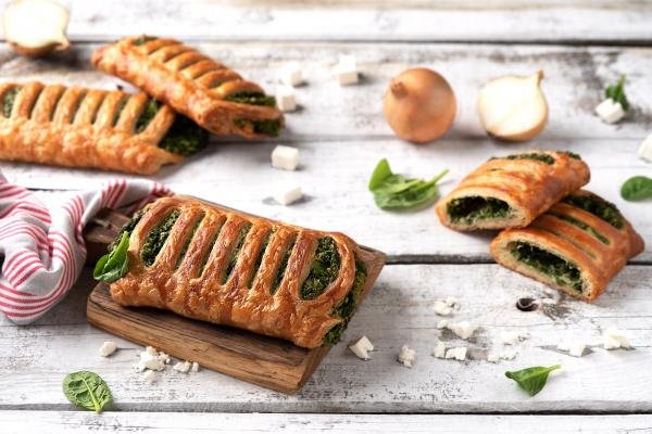 Füllung: Spinat* (23%), Zwiebelwürfel*, VOLLMILCHPULVER*, WEISSER KÄSE* (4%), Maisquellstärke*, Olivenöl*, Gewürze (Zwiebelpulver*, Pfeffer*), Meersalz