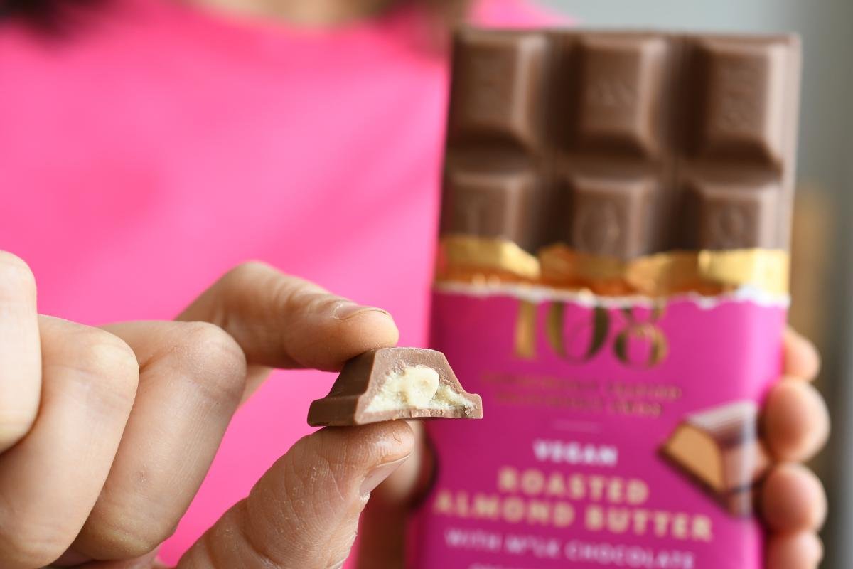 Unsere Geröstete-Mandelbutter-Schokolade hat eine köstlich-nussige, cremige Mandelfüllung, die auf der Zunge zergeht, umhüllt von unserer hauseigenen, veganen schweizer M’lk-Schokolade – Genuss ohne Kompromiss.