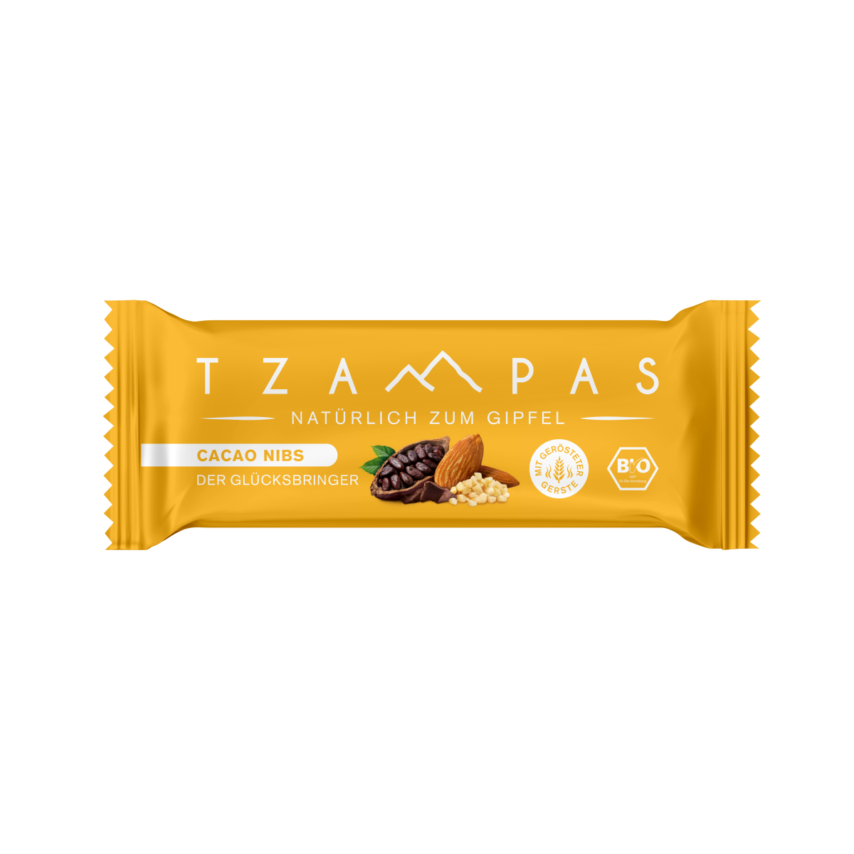 Der TZAMPAS Cacao Nibs Riegel vereinigt den mild-nussigen Geschmack gerösteter Bio-Gerste mit dem zartherben Aroma von Cacao Nibs. Langkettige Kohlenhydrate versorgen deinen Körper nachhaltig mit Energie.