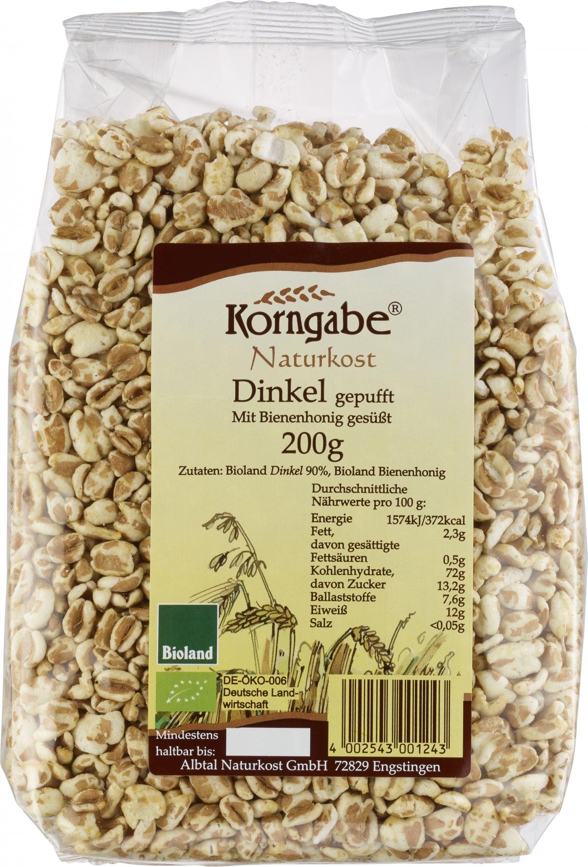 Korngabe Dinkel gepufft mit Honig, 200 gr Packung